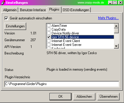 Wechselt jetzt zum Menü "Plugins" und markiert das Kästchen vor "Igor SFH-56 device",und klickt auf "Übernehmen".