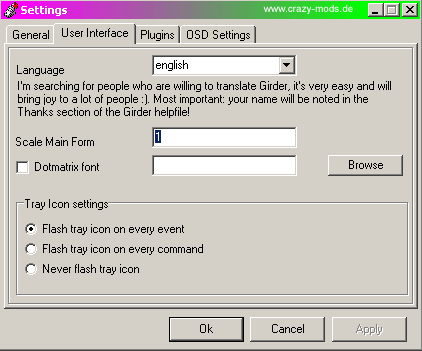 Als erstes einmal erledigt ihr die Grundeinstellungen, und richtet den IR-Empfänger ein. Dafür öffnet ihr Girder und wählt im Menü "File" die Option "Settings". Dort wählt ihr das Menü "User Interface" aus.